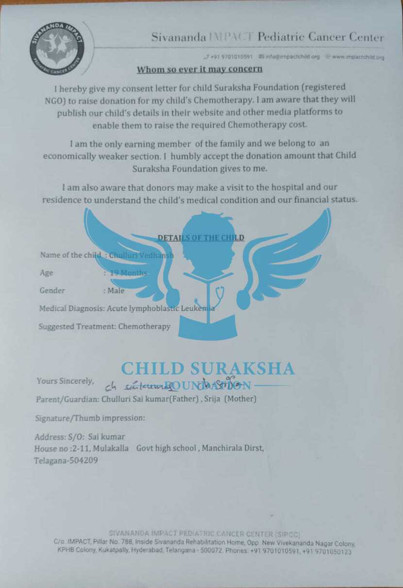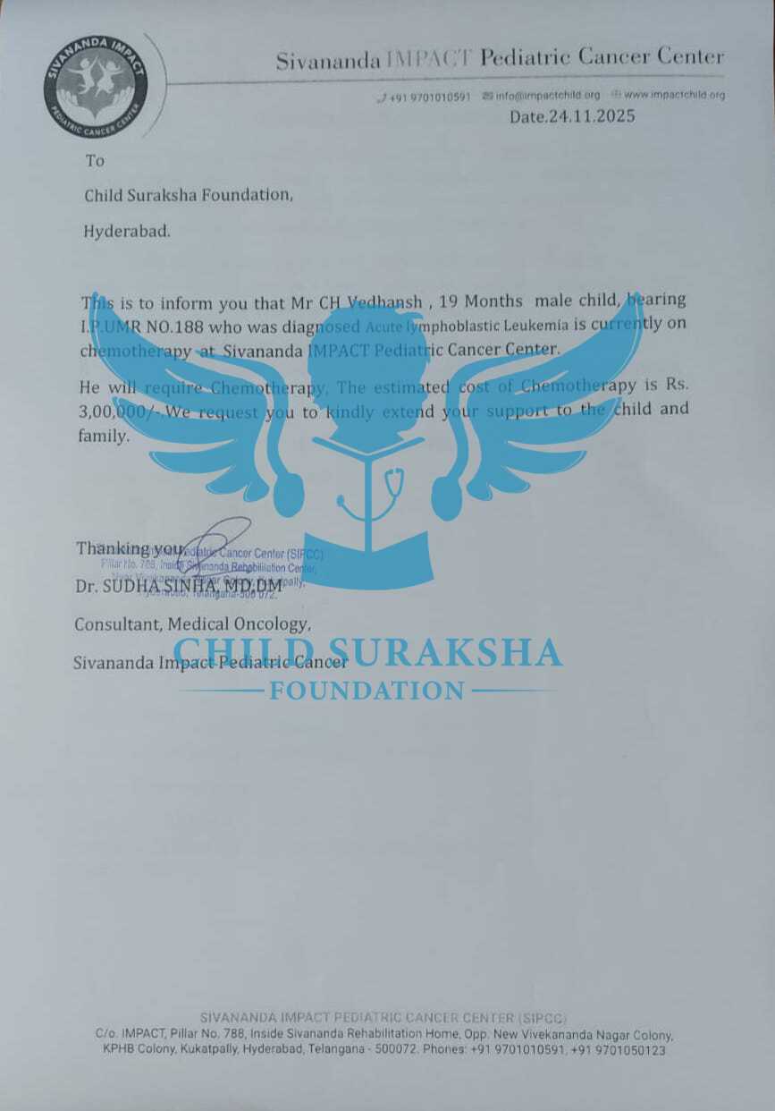 This is to inform you that Mr CH Vedhansh, 19 Months male child, bearing LP.UMR NO.188 who was diagnosed Acute lymphoblastic Leukemia is currently on chemotherapy at Sivananda IMPACT Pediatric Cancer Center.He will require Chemotherapy. The estimated cost of Chemotherapy is Rs. 3,00,000/- We request you to kindly extend your support to the child and family.