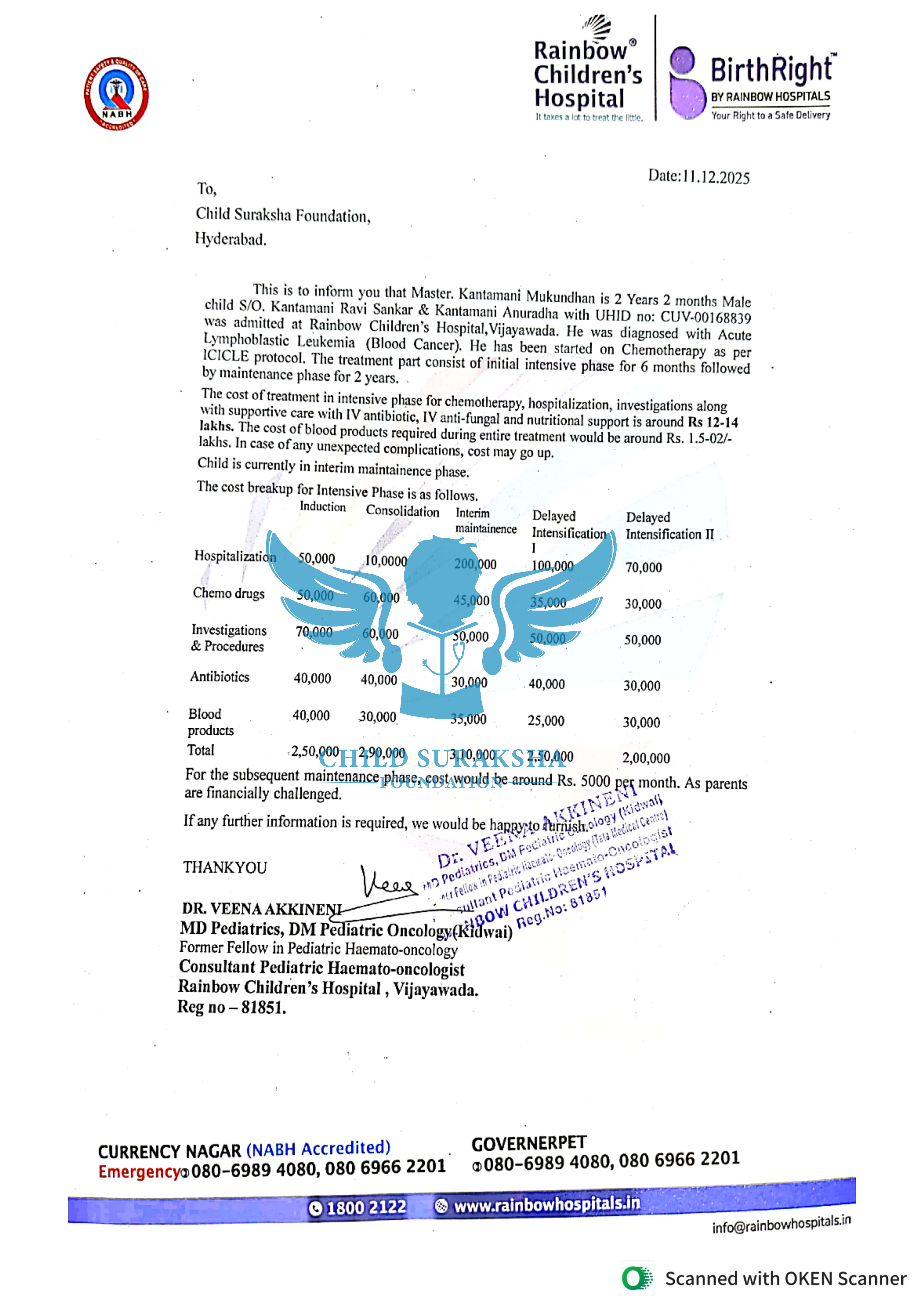 This is to inform you that Master. Kantamani Mukundhan is 2 Years 2 months Male child S/o. Kantamani Ravi Sankar & Kantamani Anuradha with UHID no: CUV-00168819 was admitted at Rainbow Children's Hospital, Vijayawada. He was diagnosed with Acute Lymphoblastic Leukemia (Blood Cancer). He has been started on Chemotherapy as per ICICLE protocol. The treatment part consist of initial intensive phase for 6 months followed by maintenance phase for 2 years.