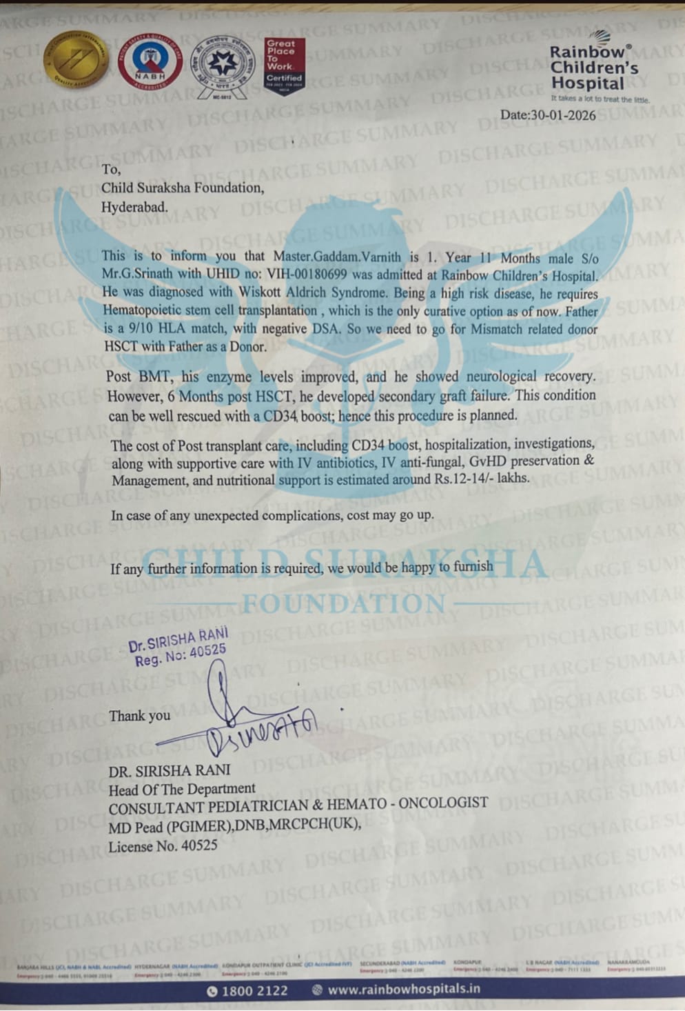 This is to inform you that Master Gaddam.Varnith is 1. Year 11 Months male Slo Mr.G.Srinath with UHID no: VIH-00180699 was admitted at Rainbow Children's Hospital. He was diagnosed with Wiskott Aldrich Syndrome. Being a high risk disease, he requires Hematopoietic stem cell transplantation, which is the only curative option as of now. Father is a 9/10 HLA match, with negative DSA. So we need to go for Mismatch related donor HSCT with Father as a Donor.