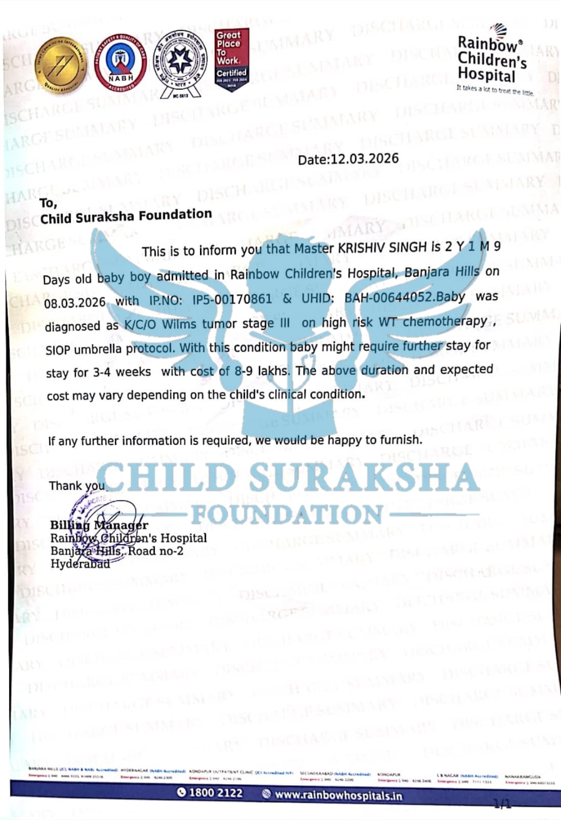 This is to inform you that Master KRISHIV SINGH is 2 Y 1 M 9 Days old baby boy admitted in Rainbow Children's Hospital, Banjara Hills on 08.03.2026 with IP.NO: IP5-00170861 & UHID: BAH-00644052.Baby was diagnosed as K/C/O Wilms tumor stage III on high risk WT chemotherapy. SIOP umbrella protocol. With this condition baby might require further stay for stay for 3-4 weeks with cost of 8-9 lakhs. The above duration and expected cost may vary depending on the child's clinical condition.